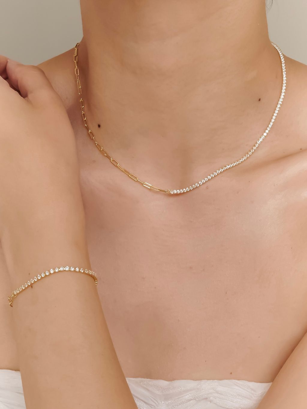 • 歐美時尚必備網球排鑽拼接金鏈條,高級又有個性,完整妳的日常時尚穿搭!