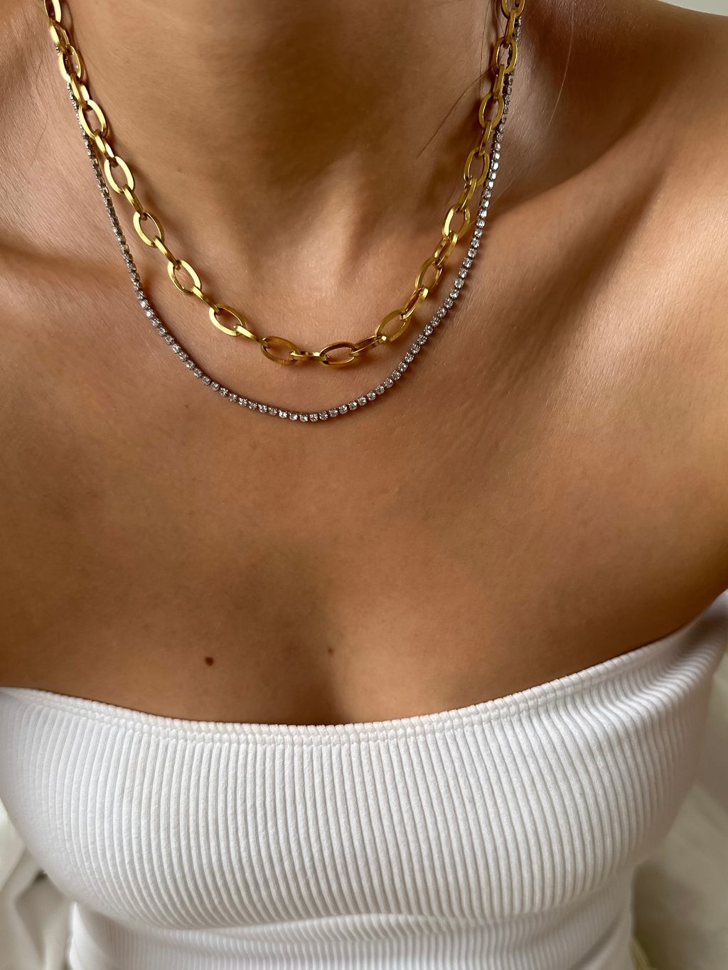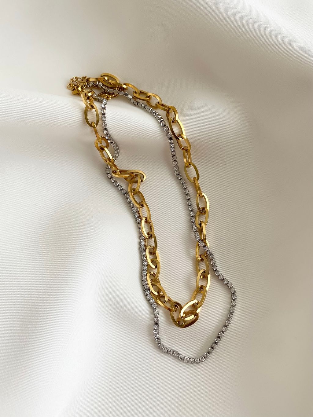 • 高級感滿滿的雙層時尚金鍊搭配閃鑽銀鍊,買一條就能有疊戴造型的懶人必備!